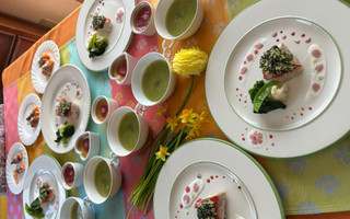 今月の旬のお野菜や季節を楽しめるレシピは、植物性のみで簡単に作れるサワーディップを使った前菜、同じく先生のアイディアの賜物のヴィーガンチーズをメインのお魚料理のソースに使ったり、グリーンピースを使ったサンジェルマンスープとは、糀屋さんの白みそと発酵バターで美味しいポタージュに!