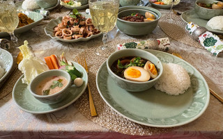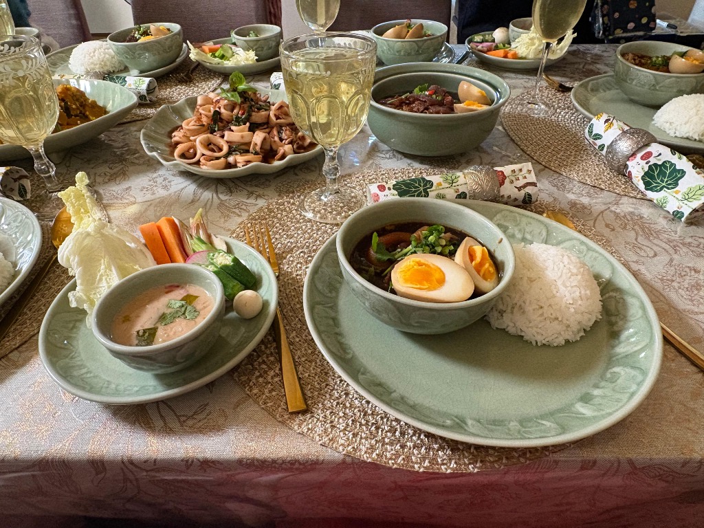 ターさんのお母様から、本場タイの家庭料理を五感で楽しめる素敵なレッスンでした!とろとろの豚足煮込みやピリ辛のイカのガパオ炒めなど、どの料理も感動のおいしさ。特にエビと豆醤のココナツディップは野菜が止まらないほど濃厚!デザートの黒豆もち米ココナツミルクも優しい甘さで大満足。ターさん親子の温かいレッスン、タイにいるような楽しいひとときでした。