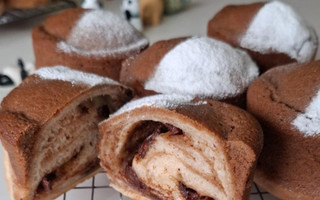 雪にも挫けず、参加しました。チョコクッキーぱん。生地にもチョコ、中にもチョコ、やっぱりチョコぱん美味しいです。仕上げのシュガーパウダーは雪のようでした。